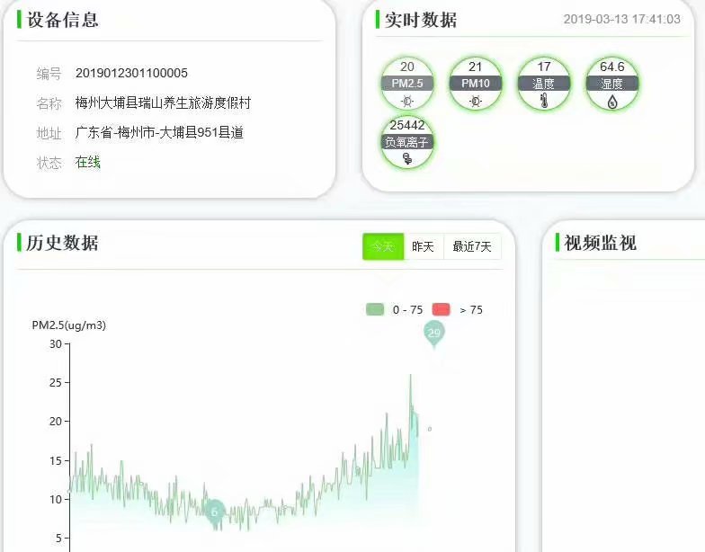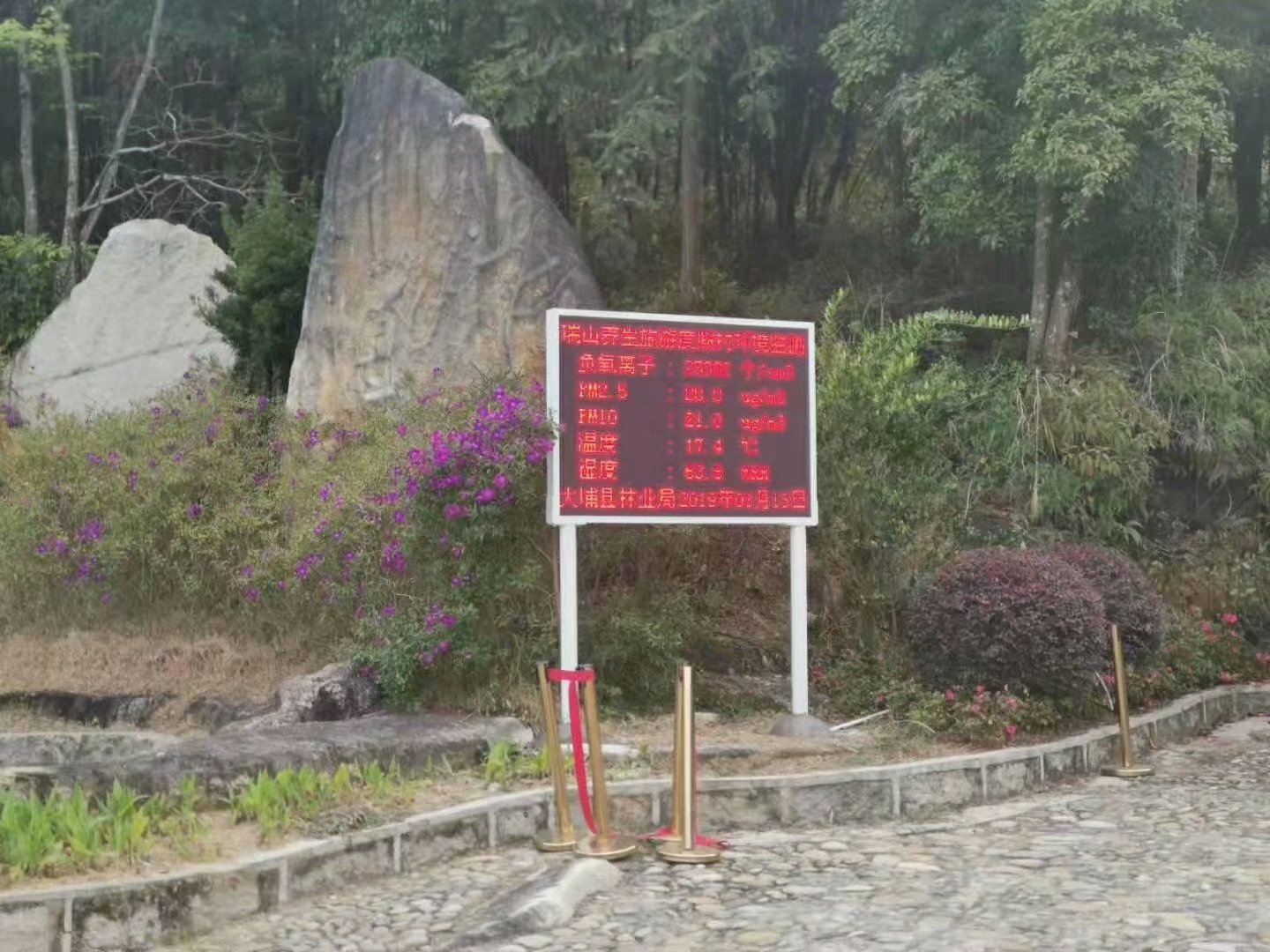 瑞山養生旅游度假村 項目地址:梅州大埔縣 配置:負氧離子 PM2.5 PM10 溫度 濕度 ,遠距離無線傳輸,景區現場LED大屏幕顯示實時監測數據