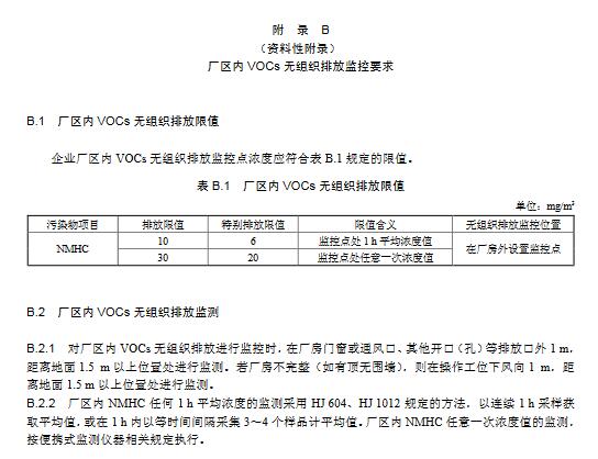 5.8 企業廠區內VOCs無組織排放監控要求地方生態環境主管部門可根據當地環境保護需要,對廠區內VOCs無組織排放狀況進行監控,具體實施方式由各地自行確定。廠區內VOCs無組織排放監控要求參見附錄B。