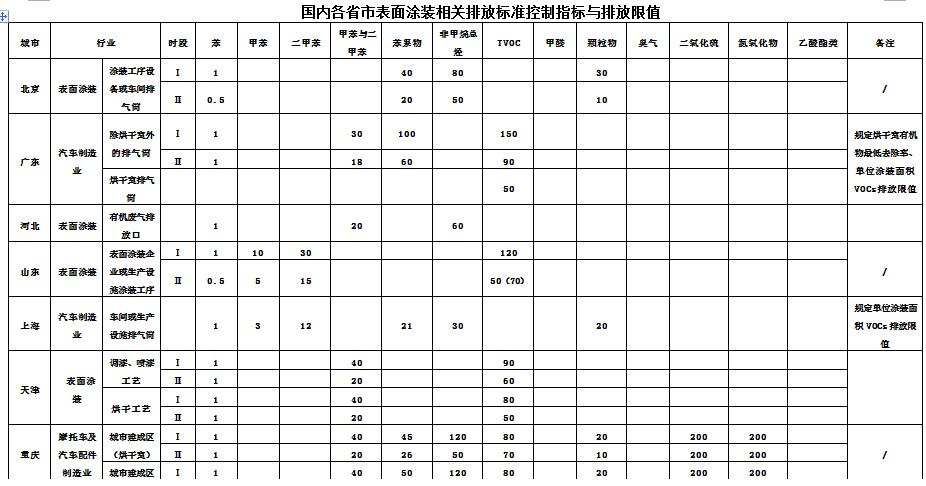 各省市汽車表面涂裝VOCs排放標準匯總及對比