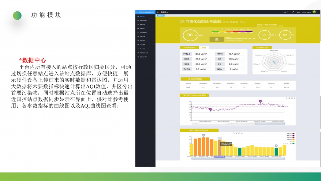 平臺內所有接入的站點按行政區歸類區分,可通過切換任意站點進入該站點數據庫,方便快捷;展示硬件設備上傳過來的實時數據和雷達圖,并運用大數據將六要數指標快速計算出AQI數值,并區分出首要污染物;同時根據站點所在位置自動選擇出最近國控站點數據同步顯示在界面上,供對比參考使用;各參數指標的曲線圖以及AQI曲線圖查看;