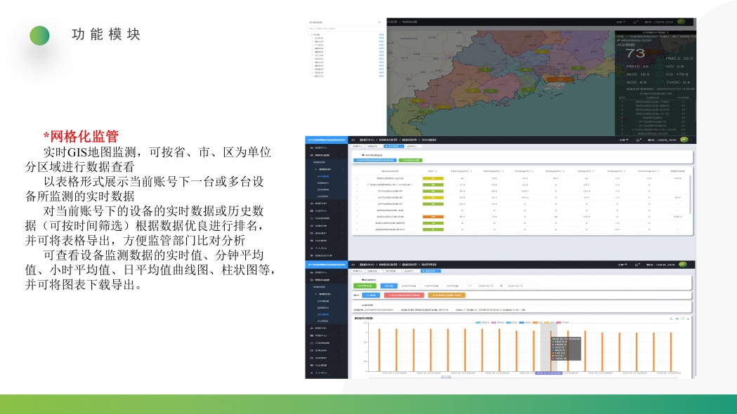 實時GIS地圖監測,可按省、市、區為單位分區域進行數據查看以表格形式展示當前賬號下一臺或多臺設備所監測的實時數據對當前賬號下的設備的實時數據或歷史數據(可按時間篩選)根據數據優良進行排名,并可將表格導出,方便監管部門比對分析可查看設備監測數據的實時值、分鐘平均值、小時平均值、日平均值曲線圖、柱狀圖等,并可將圖表下載導出。