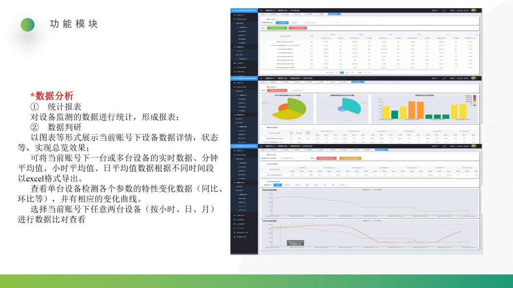 以圖表等形式展示當前賬號下設備數據詳情,狀態等,實現總覽效果;可將當前賬號下一臺或多臺設備的實時數據、分鐘平均值、小時平均值、日平均值數據根據不同時間段以excel格式導出。查看單臺設備檢測各個參數的特性變化數據(同比、環比等),并有相應的變化曲線。選擇當前賬號下任意兩臺設備(按小時、日、月)進行數據比對查看