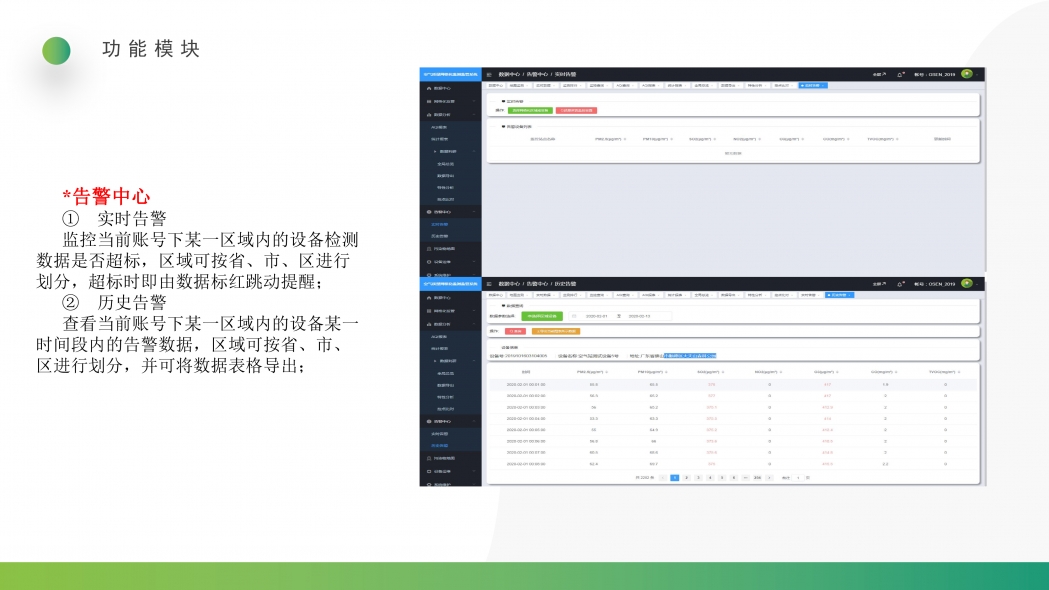 監控當前賬號下某一區域內的設備檢測數據是否超標,區域可按省、市、區進行劃分,超標時即由數據標紅跳動提醒;