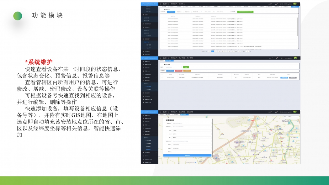 快速添加設備,填寫設備相應信息(設備號等),并附有實時GIS地圖,在地圖上選點即自動填充該安裝地點位所在的省、市、區以及經緯度坐標等相關信息,智能快速添加