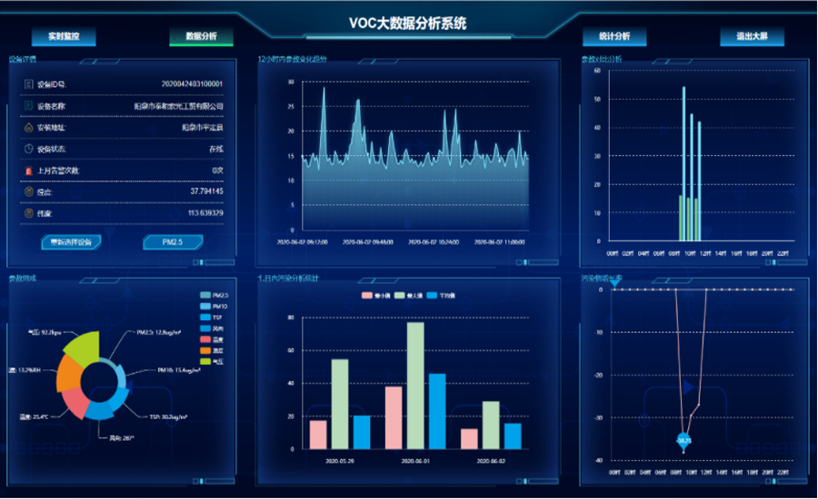 平臺數據大屏,顯示所有前端設備的實時狀態和監測數據,便于管理部門更好地實施污染排放情況的全局監控、預警和協調調 度,及時控制超標排放,避免環境污染擴大。
