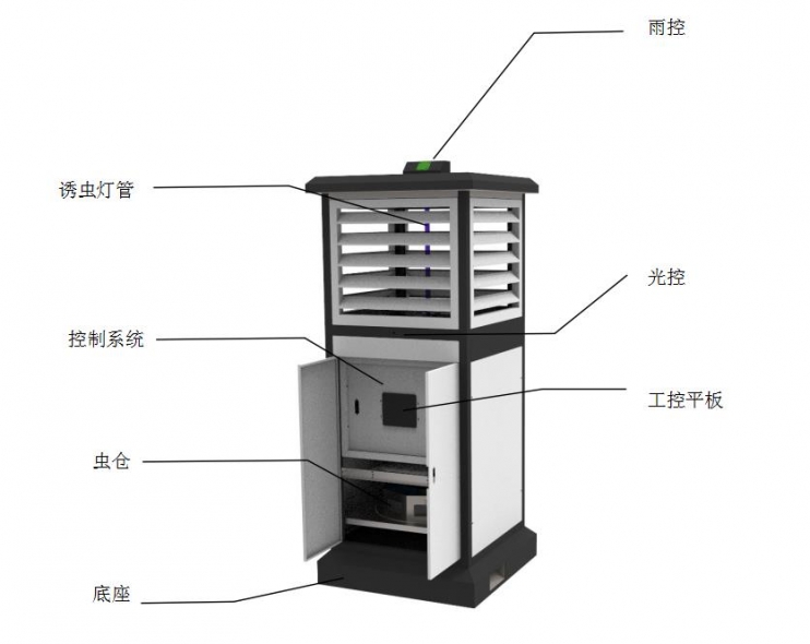 系統(tǒng)采用不銹鋼整體結(jié)構(gòu),利用光、電、數(shù)控技術(shù),物聯(lián)網(wǎng)系統(tǒng),氣象系統(tǒng)等多種系統(tǒng),實現(xiàn)蟲體遠紅外自動處理、接蟲盒自動轉(zhuǎn)換、整燈自動運行等功能;在無人監(jiān)管的情況下,能自動完成誘蟲、殺蟲、收集、分裝、排水等系統(tǒng)作業(yè)。該系統(tǒng)對昆蟲的發(fā)生、發(fā)展進行監(jiān)測、分析和預(yù)測,為農(nóng)業(yè)現(xiàn)代化提供服務(wù),滿足蟲情測報、采集標本的需要。